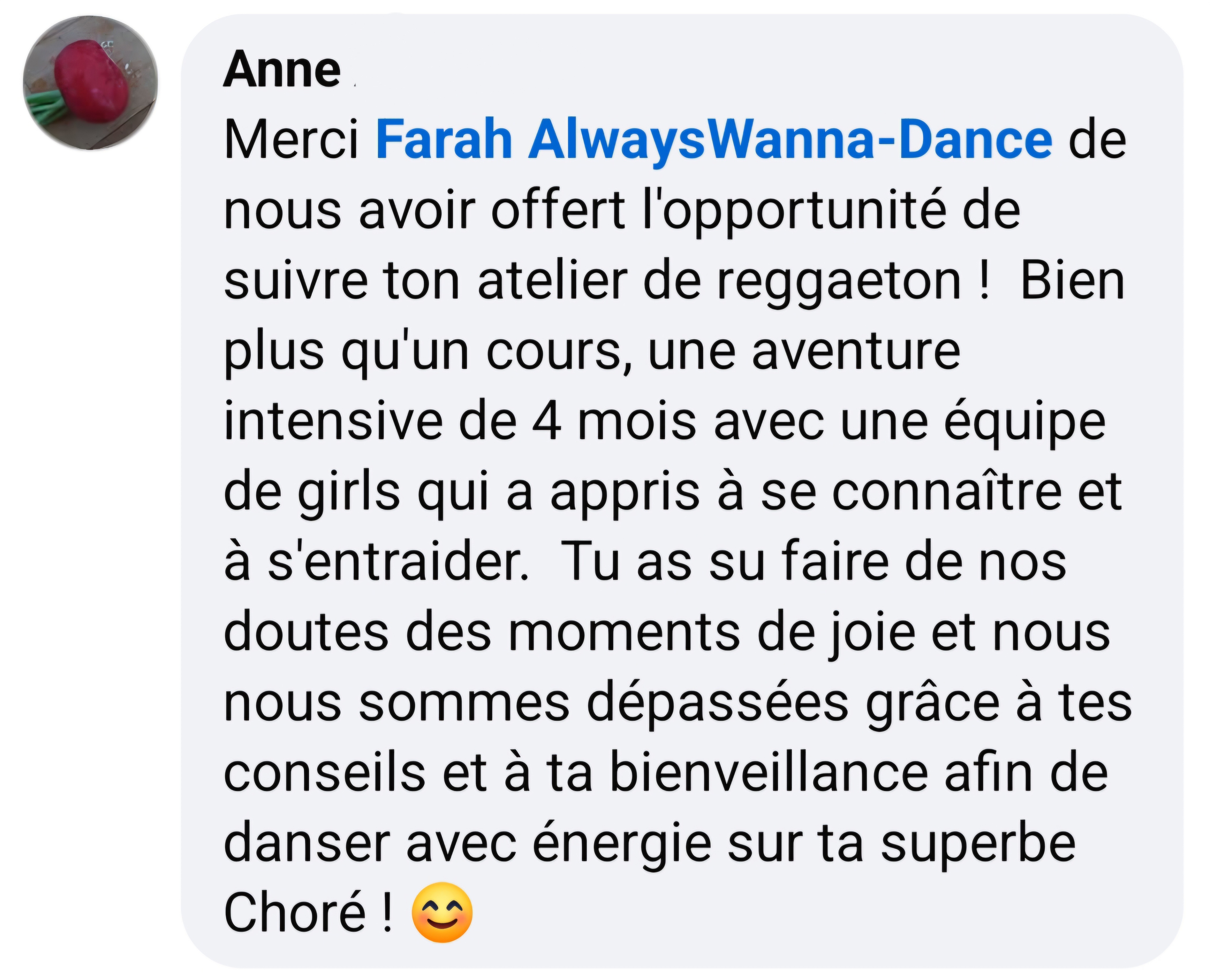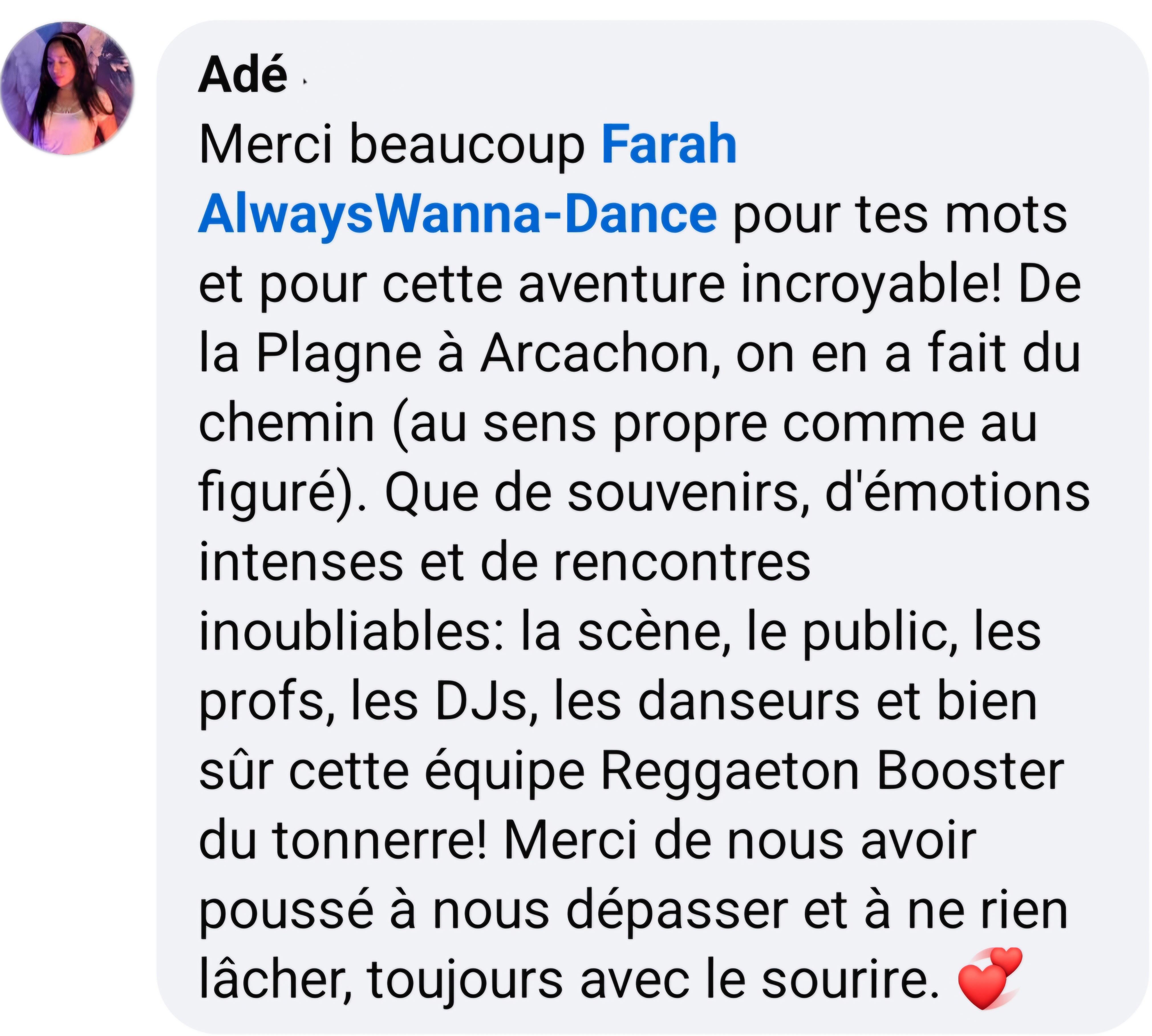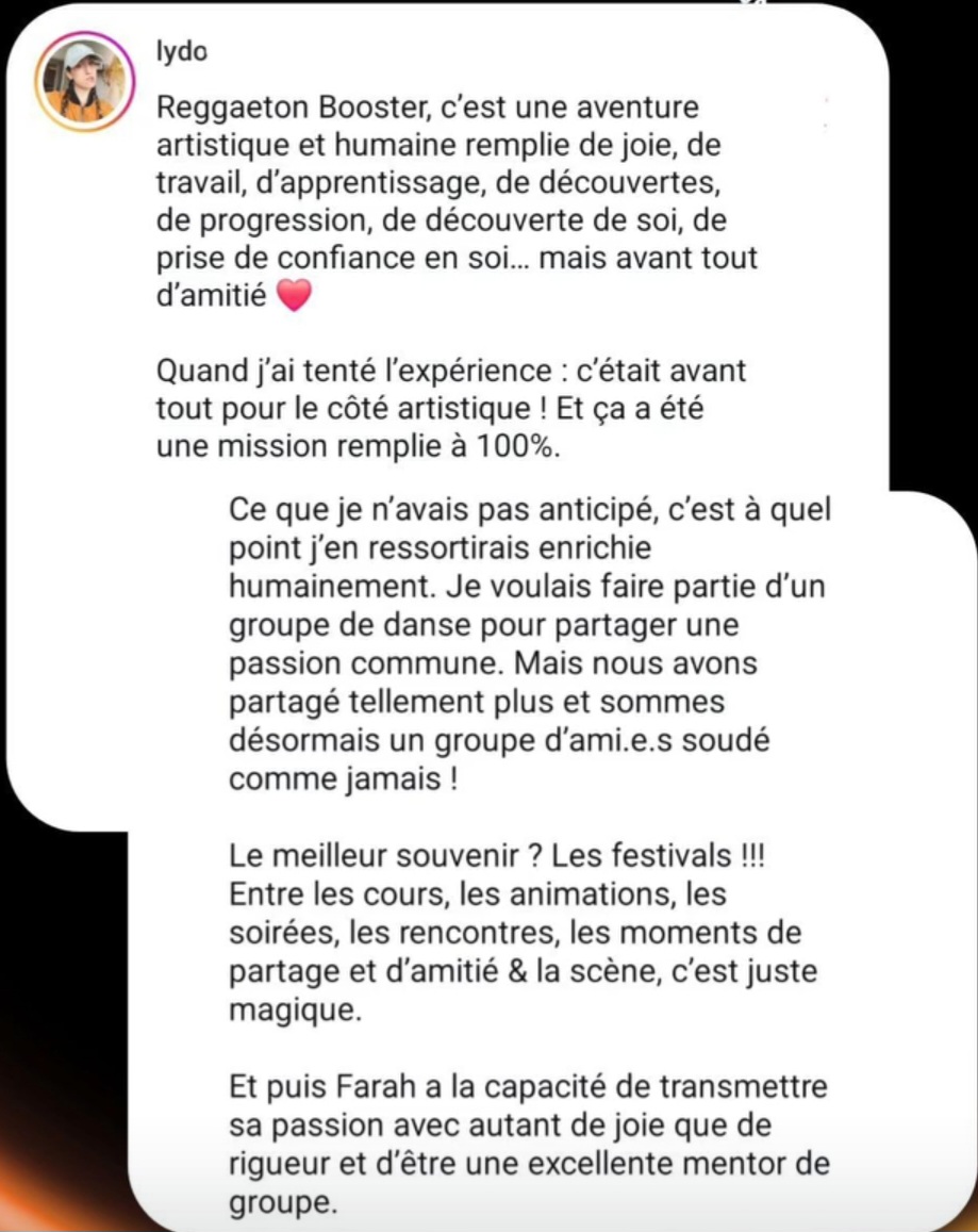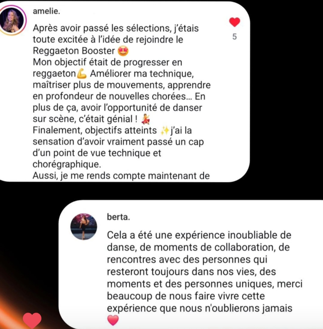 > Donne le meilleur de toi-même en cours/stages (Précisions des mouvements, Energie, Sourire,...)...
