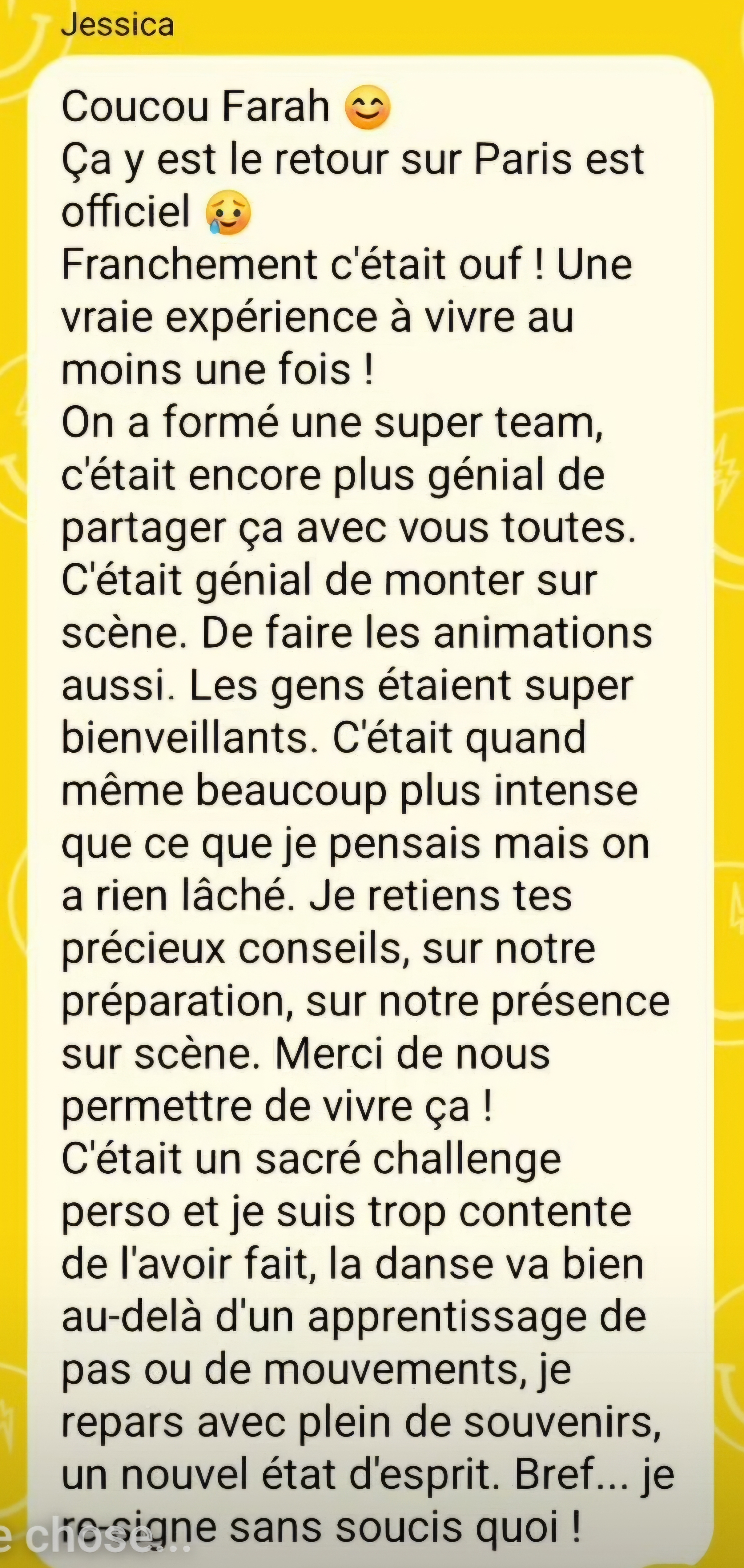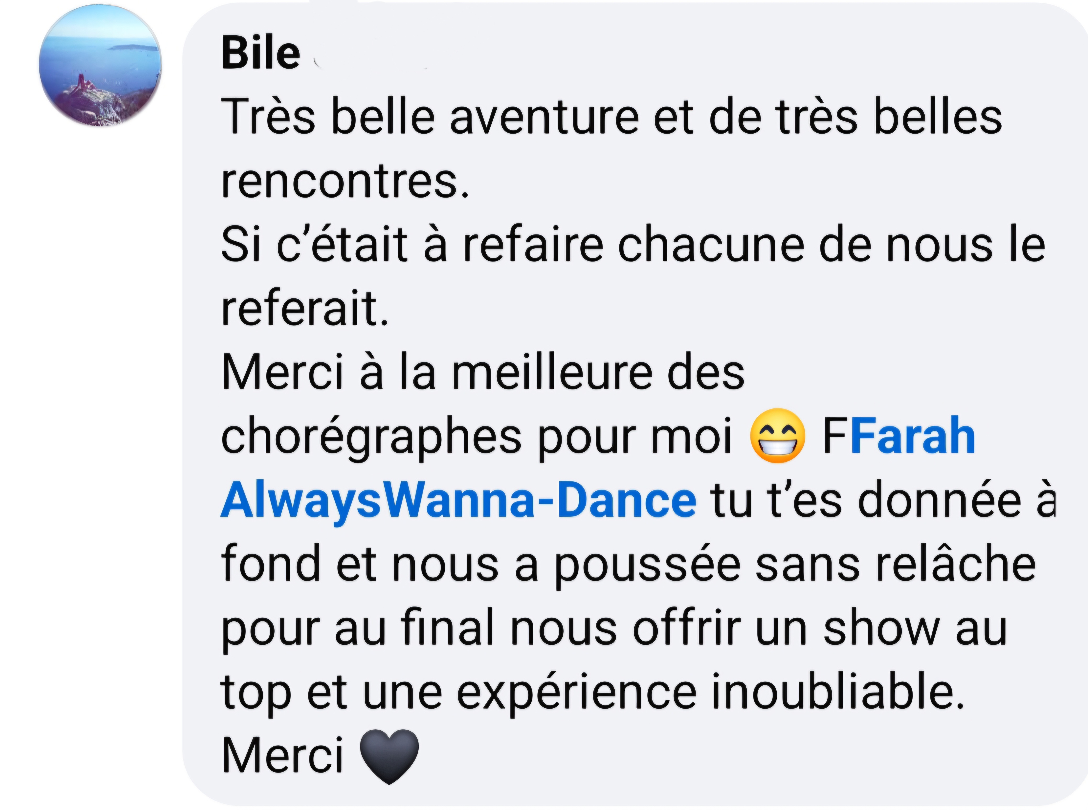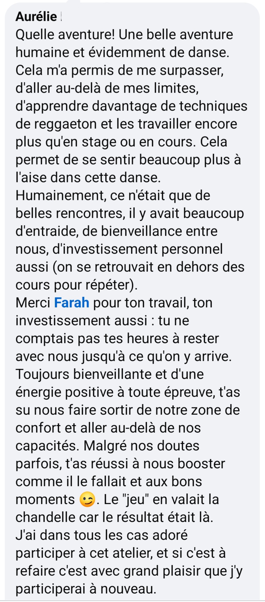 > Donne le meilleur de toi-même en cours/stages (Précisions des mouvements, Energie, Sourire,...)...