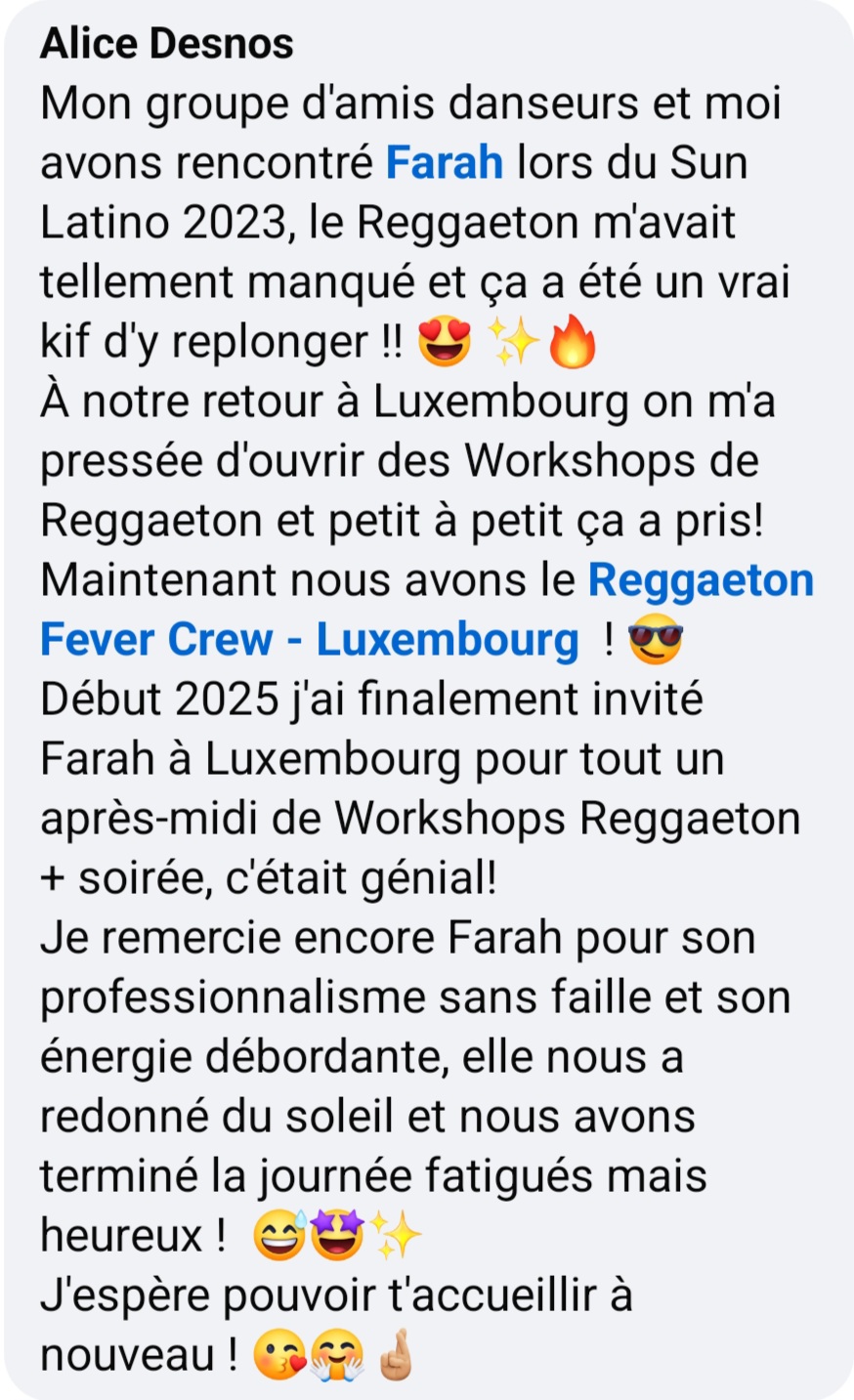 J'ai a crée un "programme spécial" en 3h ou 4h appelé : "UPGRADE YOUR REGGAETON" - idéal pour des élèves qui ont déjà des bases en REGGAETON.